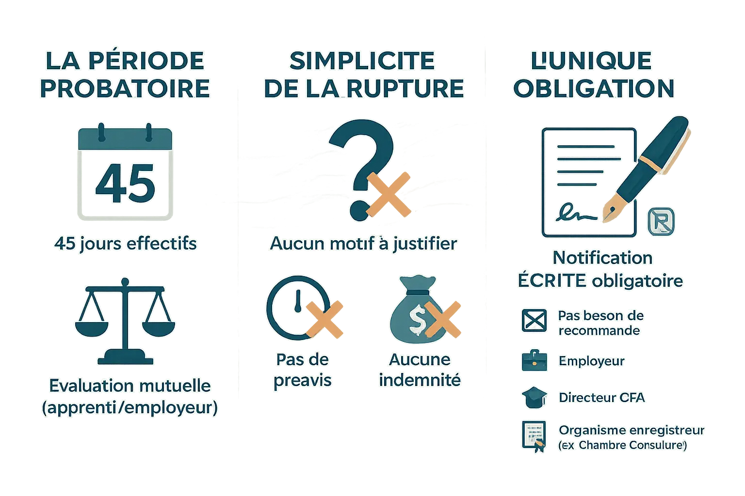 Pendant la période probatoire (45 jours) | Non | Non | Notification écrite (employeur, CFA, organisme d’enregistrement) |